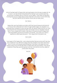 Take a look at some of the feedback from our current and previous parents who have enrolled into our Children Center. Listen to their experience here at Happy Kids Learning Academy.