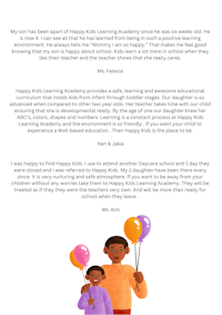 Take a look at some of the feedback from our current and previous parents who have enrolled into our Children Center. Listen to their experience here at Happy Kids Learning Academy.